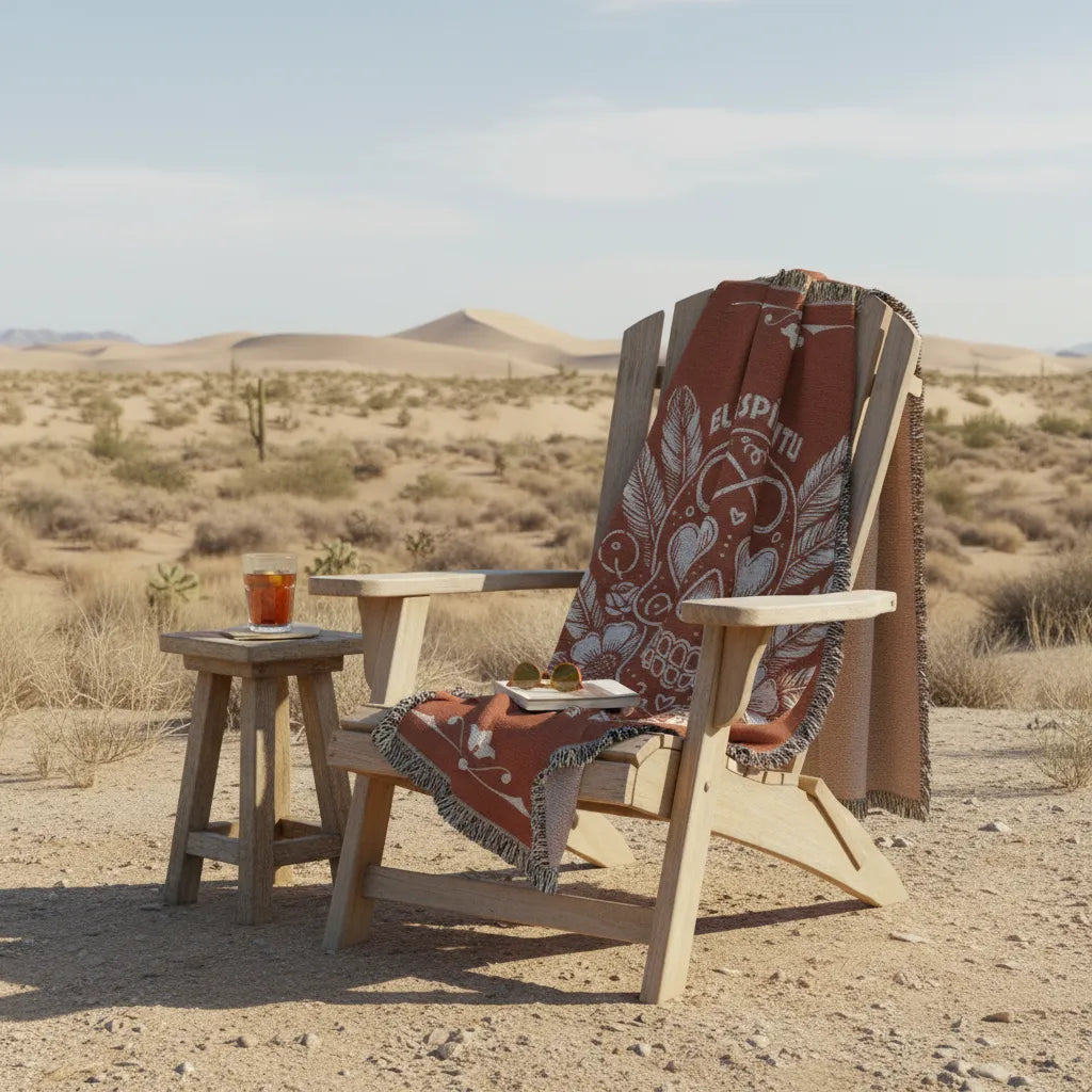 Celebrate the soul of the desert with our El Espíritu del Oeste Heirloom Woven Blanket, a tribute to the Vaquero spirit that shaped the American West. Designed in the timeless Mexican-Western style, this piece features a hand-drawn sugar skull surrounded by desert florals and feathers, symbols of strength, love, and eternal freedom.