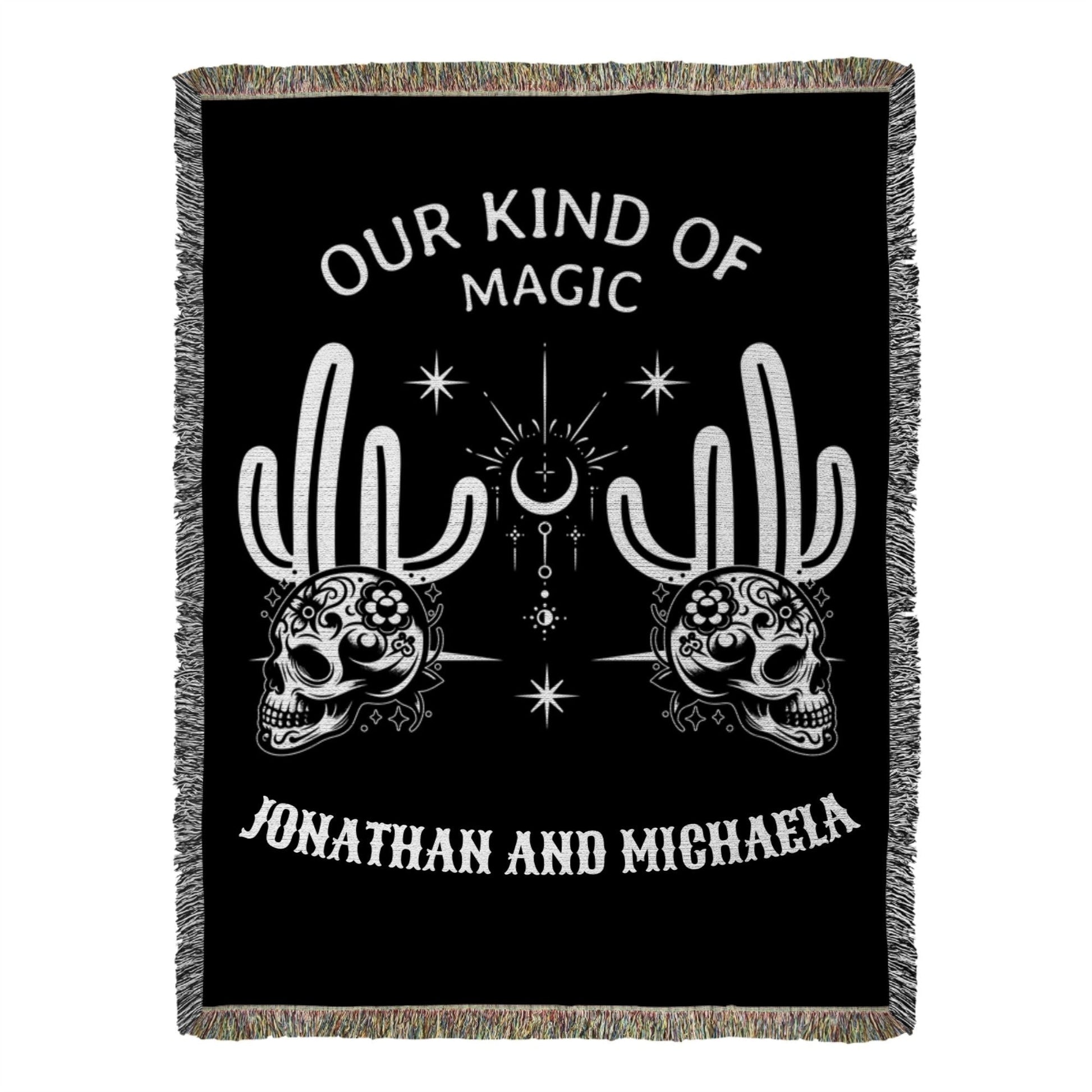 For the couple that doesn’t fit the mold — this blanket celebrates the wild, mysterious, magnetic energy between two souls who found each other in a world full of noise. Designed with bold desert iconography, sugar-skull artistry, and celestial symbolism, this woven heirloom piece captures the kind of love that feels cosmic, fated, and unmistakably yours.