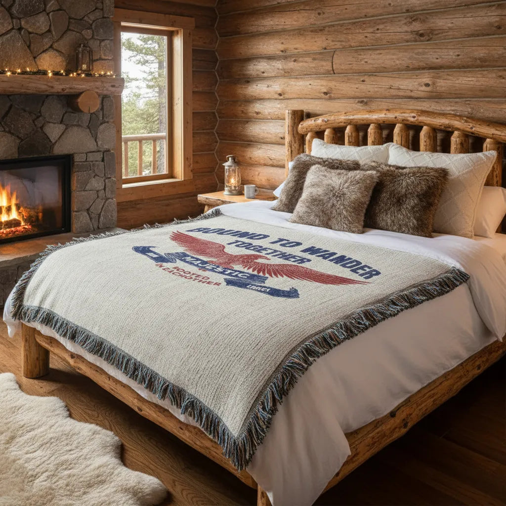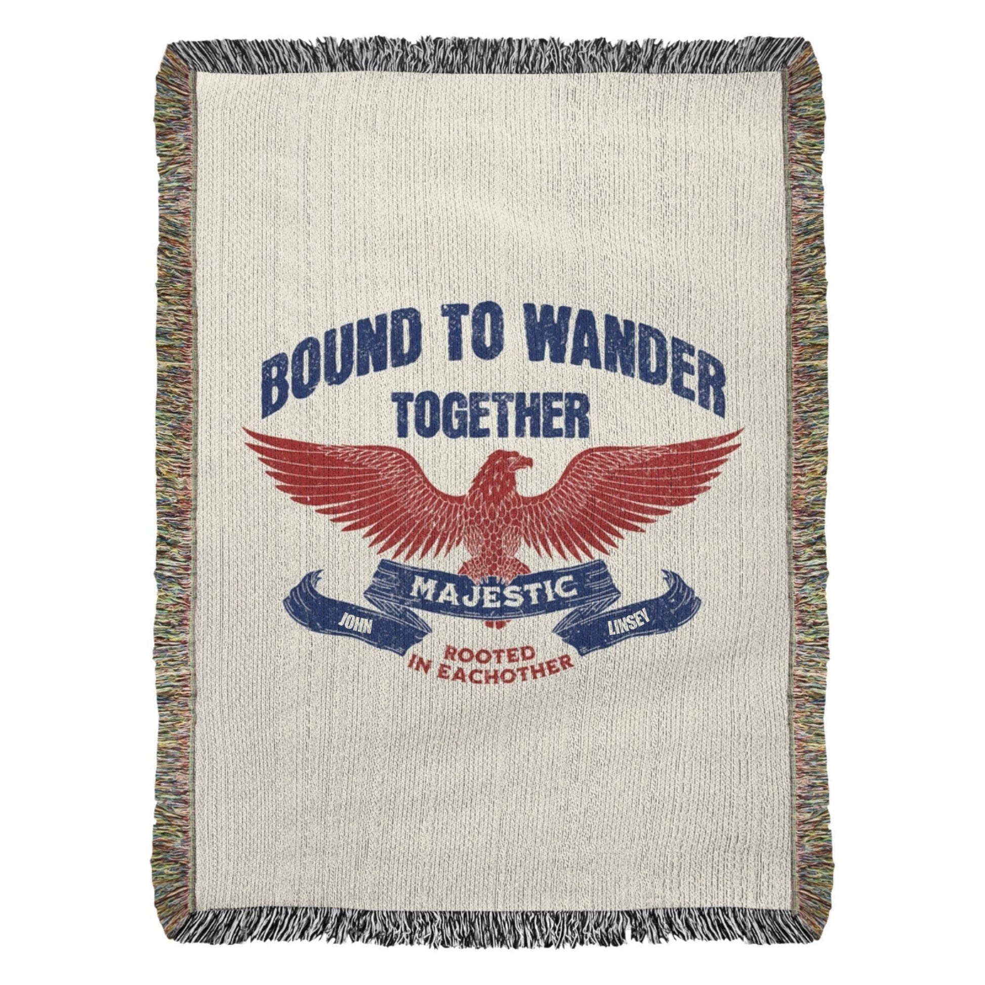 For the ones who roam wild, side-by-side. This heirloom woven blanket celebrates two souls who choose adventure, freedom, and each other, wherever the road leads next. Featuring a bold Americana eagle crest and space to personalize both names, this piece becomes a meaningful keepsake that feels like a story passed down, not just a gift.